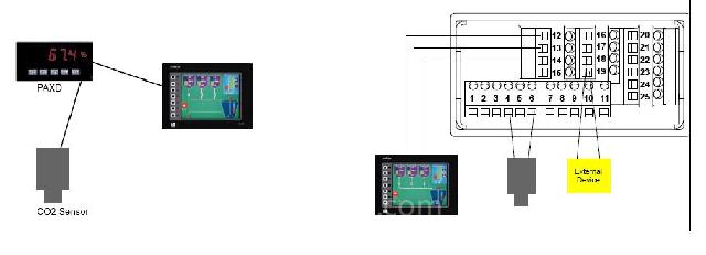 PAXD多用途DC輸入表能夠讀出CO2傳感器的輸出(傳感器輸出為DC值),用PAXD為比例因子,很方便地使原始值變成便于閱讀的所需顯示,采用G310觸摸屏后,相應(yīng)數(shù)據(jù)所以從PAXD中被讀到G310中,并且G310能夠修改設(shè)定PAXD中的模擬量輸出值,達到監(jiān)視/控制CO2的濃度。