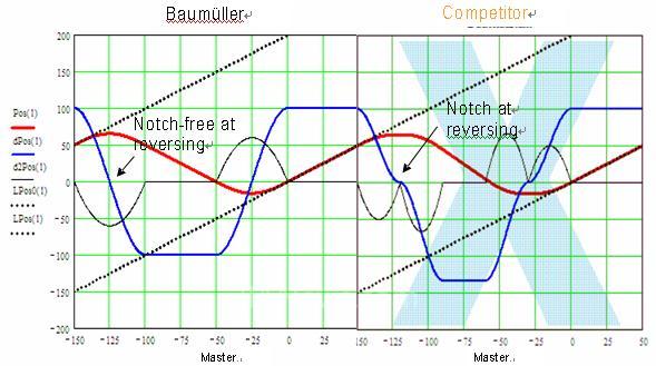 上圖顯示了包米勒的無(wú)齒槽運(yùn)動(dòng)(在左邊)。右邊有一個(gè)競(jìng)爭(zhēng)同行系統(tǒng)的案例在回動(dòng)點(diǎn)存在齒槽口。包米勒系統(tǒng)的無(wú)齒槽運(yùn)動(dòng)減少了沖擊,導(dǎo)致更小的機(jī)械磨損和更高的機(jī)器速度。