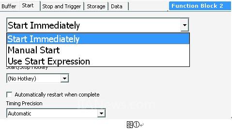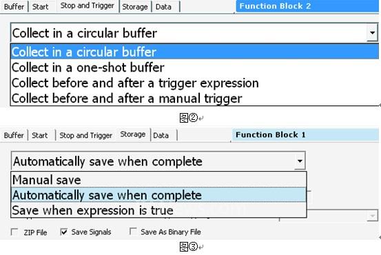 “Buffer”中可以過(guò)濾出需要或不需要采集的數(shù)據(jù);“start”中可以設(shè)置軟件開(kāi)始數(shù)據(jù)采集的時(shí)刻,可以基于軟件運(yùn)行時(shí)采集、接收到某個(gè)觸發(fā)條件時(shí)采集或當(dāng)用戶自己設(shè)置的表達(dá)式為真時(shí)采集,如發(fā)動(dòng)機(jī)轉(zhuǎn)速大于5000等(見(jiàn)圖①);“stop and trigger”選項(xiàng)設(shè)置數(shù)據(jù)保存方式,可以將采集到的數(shù)據(jù)保存到不同的緩存器中如一次性緩存器(保存固定數(shù)量的數(shù)據(jù),當(dāng)存滿以后自動(dòng)創(chuàng)建新的文件保存新的數(shù)據(jù))、循環(huán)緩存器(始終保存最新的給定數(shù)量的數(shù)據(jù))、基于觸發(fā)點(diǎn)的數(shù)據(jù)保存(保存觸發(fā)點(diǎn)滿足之前或之后設(shè)定數(shù)量的數(shù)據(jù),用于檢查模塊故障,見(jiàn)圖②);“storage”選項(xiàng)用于設(shè)置采集完畢的條件,可以由軟件自動(dòng)保存數(shù)據(jù),也可以基于手動(dòng)或某個(gè)觸發(fā)保存數(shù)據(jù)或設(shè)置某個(gè)表達(dá)式來(lái)控制數(shù)據(jù)保存。