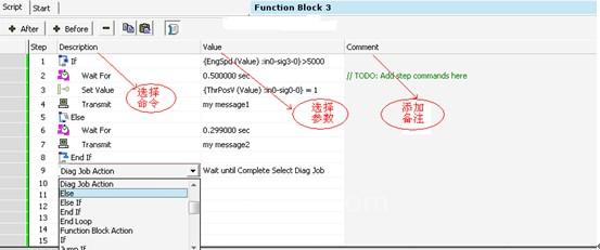Vehicle spy的另一個(gè)亮點(diǎn)就是可以通過(guò)其自身的腳本語(yǔ)言來(lái)創(chuàng)建自動(dòng)測(cè)試步驟,工程師只需要選擇命令然后選擇參數(shù)即可創(chuàng)建邏輯序列來(lái)實(shí)現(xiàn)自動(dòng)測(cè)試而無(wú)需編程基礎(chǔ),見(jiàn)圖④。