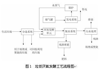 厭氧發(fā)酵工藝主要用來處理有機(jī)生活垃圾。厭氧發(fā)酵工藝一般由分選預(yù)處理、厭氧發(fā)酵、后處理(沼氣利用、殘?jiān)逊实?3部分組成,其主要工藝流程見圖l。處理的方法是:先將運(yùn)來的垃圾進(jìn)行機(jī)械和人工分檢,以分離不可發(fā)酵部分。分檢后的垃圾再進(jìn)入精分檢池內(nèi)進(jìn)行砂石和泥土分離,分檢后的大量有機(jī)物經(jīng)酸化發(fā)酵,多級(jí)厭氧,發(fā)酵產(chǎn)生沼氣,沼氣凈化后用于發(fā)電,發(fā)電余熱和浮飄物燃燒后給厭氧間加溫,這樣可實(shí)現(xiàn)中恒溫厭氧發(fā)酵,大大提高降解速度,減短滯留期。沼渣可用于作高效有機(jī)肥或燃料,砂、石及泥土可作建筑原料等。