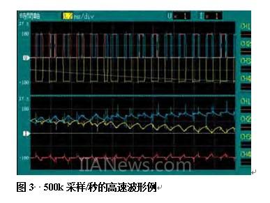 此外,3390還具備以X-Y圖表顯示來確認變頻器的動態(tài)特性的功能,變頻器不可或缺的諧波測量功能,用FFT評估影響變頻器的干擾的功能(可達100kHz)等(圖2)。而且,利用3390的500k采樣/秒的高速采樣率,來顯示電壓/電流波形(圖3)。之前,需要使用數(shù)字示波器和差分探頭、鉗式電流傳感器來觀測波形,非常麻煩,現(xiàn)在1臺3390即可實現(xiàn)。