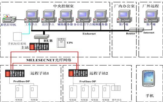 整個污水處理廠的控制系統(tǒng)由三套三菱Q系列PLC、一套西門子S7-300 PLC、兩套WebAccess6.0軟件、一套設(shè)備管理軟件、一套故障診斷軟件,一臺工程節(jié)點計算機(jī)、兩臺監(jiān)控節(jié)點計算機(jī)、一臺輔助計算機(jī)、一臺視頻服務(wù)器、手機(jī)短信系統(tǒng)、UPS電源、打印機(jī)等組成。