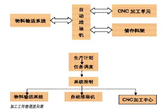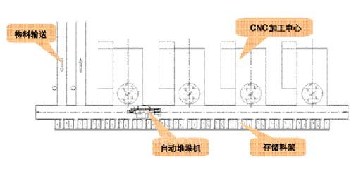 根據(jù)生產(chǎn)量的需求配置設(shè)備,配置相應(yīng)數(shù)量的CNC加工中心、對應(yīng)數(shù)量的自動堆垛機(jī)和工件存儲貨位,為了減少CNC加工設(shè)備因更換加工工件的閑置時間,在加工中心接駁臺設(shè)置工件等待工位,當(dāng)CNC加工中心完成一個工件加工送出加工完畢工件的同時,送入一個待加工工件。
