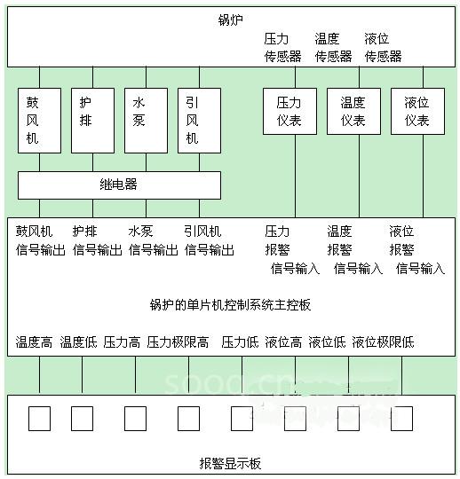 如圖2-1所示,鍋爐上裝有溫度、壓力、液位傳感器,這些反映鍋爐運(yùn)行狀態(tài)的信號(hào)送到儀表層;儀表層包括溫度儀表、壓力儀表、液位儀表,我們可以在這些儀表上設(shè)置上限和下限,如果傳感器送來(lái)的信號(hào)高于我們?cè)O(shè)定的上限或低于我們?cè)O(shè)定的下限,儀表內(nèi)部的繼電器開關(guān)就會(huì)合上,代表上限或下限的輸出信號(hào)就會(huì)輸出高電平,這些信號(hào)作為系統(tǒng)主控板的開關(guān)量信號(hào)輸入:系統(tǒng)主控板的輸出控制信號(hào)經(jīng)過(guò)繼電器后和系統(tǒng)執(zhí)行機(jī)構(gòu)相連,繼電器是一種可以以小電流驅(qū)動(dòng)大電流的物理元件,我們系統(tǒng)輸出的信號(hào)電壓比較低,不能直接驅(qū)動(dòng)大功率用電器[3-4]。因此中間要接繼電器;主控板的另一輸出接系統(tǒng)顯示板,這樣鍋爐運(yùn)行的狀況就可以直觀的顯示給用戶。