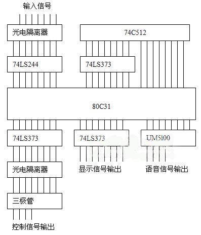 如圖2-2所示,系統(tǒng)中的報(bào)警信號(hào)進(jìn)入控制板后接到光電隔離器上,這樣可以防止干擾而使系統(tǒng)誤動(dòng)作,而后接到74LS244上,74LS244是一個(gè)八同向的三態(tài)緩沖器,通過(guò)74LS244接到80C31上;存儲(chǔ)器通過(guò)74LS373和80C31相連;80C31通過(guò)語(yǔ)音芯片UM5l00輸出語(yǔ)音報(bào)警信號(hào);80C31經(jīng)過(guò)74LS373后輸出顯示信號(hào);80C31經(jīng)過(guò)74LS273后接到光電隔離器上,又經(jīng)過(guò)三極管后輸出控制執(zhí)行信號(hào)。