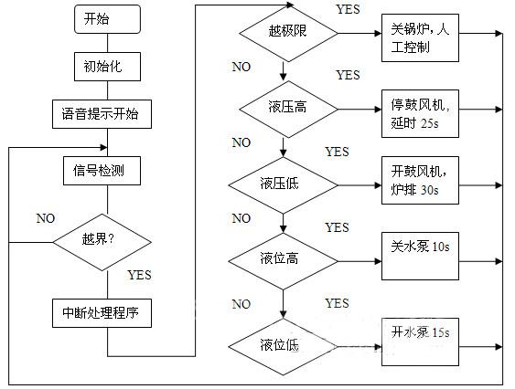 系統(tǒng)開始后進(jìn)行初始化,然后系統(tǒng)會(huì)語(yǔ)音提示鍋爐已經(jīng)打開;系統(tǒng)開始檢測(cè)信號(hào),如果信號(hào)沒(méi)有越過(guò)設(shè)定的界限,那么系統(tǒng)會(huì)繼續(xù)檢測(cè),否則系統(tǒng)會(huì)進(jìn)入中斷處理程序;在中斷處理程序中,將會(huì)先判斷是否有液位極限低信號(hào)輸入和壓力極限高信號(hào)輸入,如果有則語(yǔ)音報(bào)警并停止鍋爐的自動(dòng)運(yùn)行改為手動(dòng)操作,否則向下檢測(cè)液位、溫度、壓力是否高于上限或低于下限;如果有溫度、壓力高信號(hào)輸入就停止鼓風(fēng)機(jī)并延時(shí)15s后中斷返回繼續(xù)檢測(cè),否則向下檢測(cè);如果有溫度、壓力低信號(hào)輸入就開鼓風(fēng)機(jī)和爐排并延時(shí)30s后中斷返回繼續(xù)檢測(cè),沒(méi)有就向下檢測(cè);如果有液位高信號(hào)輸入就停止水泵并延時(shí)10s后中斷返回繼續(xù)檢測(cè),否則向下檢測(cè);如果有液位低信號(hào)輸入就開水泵并延時(shí)15s后中斷返回繼續(xù)檢測(cè)。