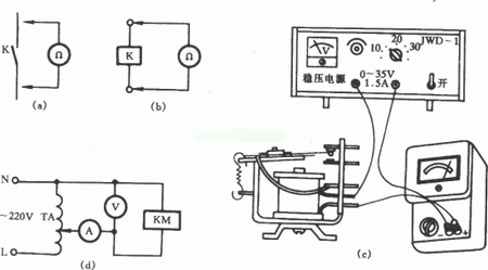 (4)測量交流接觸器、中間的吸合、釋放電壓、電流。如圖(d)所示,將調(diào)壓器TA接通220V電源后,調(diào)動(dòng)調(diào)壓手輪。電流表A、電壓表V指示值逐漸上升,當(dāng)聽到“咔噠”一聲接觸器(或中間繼電器)吸合時(shí),A值為吸合電流值,V值為吸合電壓值。然后調(diào)動(dòng)調(diào)壓手輪使電壓下降,當(dāng)聽到“叭”的接觸器釋放聲時(shí),A表指示值為釋放電流,V表則為釋放電壓值。如果線圈是380V的,則需要用兩只調(diào)壓器串聯(lián),以獲得較高的試驗(yàn)電壓。