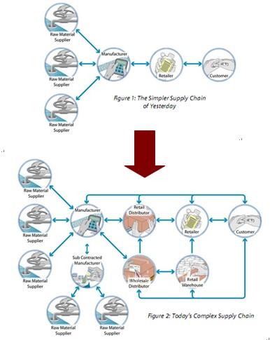 制造和物流設(shè)施及流程網(wǎng)絡(luò)構(gòu)成現(xiàn)代供應(yīng)鏈,包括原料采購(gòu)、原料加工成半成品或成品、物流配送至顧客等。多年前,供應(yīng)鏈可能非常簡(jiǎn)單、易懂(圖1),但是,隨著為降低成本而衍生的外包業(yè)務(wù)蓬勃發(fā)展,已發(fā)生由分散制造(伴隨最近的經(jīng)濟(jì)衰退)朝著現(xiàn)代供應(yīng)鏈——多重供應(yīng)商/客戶間的復(fù)雜關(guān)系轉(zhuǎn)變(圖2)。