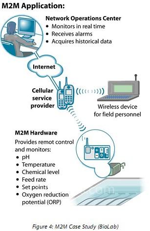 作為一個(gè)水池化學(xué)品和設(shè)備的供應(yīng)商,BioLab通過(guò)分銷(xiāo)商網(wǎng)絡(luò)和授權(quán)服務(wù)供應(yīng)商銷(xiāo)售產(chǎn)品。為了區(qū)別于了其他化學(xué)品供應(yīng)商,BioLab希望與他們的經(jīng)銷(xiāo)商,甚至化學(xué)品的終端客戶建立更密切的聯(lián)系。BioLab對(duì)客戶的商用水池、水上公園、噴泉、及其他娛樂(lè)用的水景設(shè)施使用無(wú)線M2M系統(tǒng)。在每個(gè)現(xiàn)場(chǎng),M2M系統(tǒng)收集實(shí)時(shí)數(shù)據(jù)如pH值,氧化還原電位值,化學(xué)水平、水溫等。系統(tǒng)使用嵌入式無(wú)線技術(shù)與網(wǎng)絡(luò)運(yùn)營(yíng)中心(NOC)交互。在NOC,將數(shù)據(jù)進(jìn)行集中、存儲(chǔ)處理后交給客戶、交易商或通過(guò)安全的網(wǎng)絡(luò)入口授權(quán)個(gè)人。