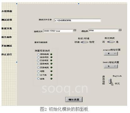 雙擊相應(yīng)的自動(dòng)化校準(zhǔn)程序圖標(biāo),系統(tǒng)啟動(dòng),進(jìn)入測(cè)試系統(tǒng)主界面,主界面的風(fēng)格以簡(jiǎn)捷實(shí)用為主,左側(cè)是各功能按鈕。首先進(jìn)入的是初始化設(shè)置模塊。初始化模塊的前面板如圖2所示,初始化模塊要設(shè)置被測(cè)試設(shè)備的校準(zhǔn)項(xiàng)目,設(shè)置被校儀器和標(biāo)準(zhǔn)源的GPIB地址,選擇是否是首次測(cè)試,此功能的目的是為了保存測(cè)量的數(shù)據(jù),防止意外發(fā)生使測(cè)量數(shù)據(jù)丟失,需要重新進(jìn)行測(cè)試。選擇中英文語(yǔ)言,選擇校準(zhǔn)、檢定,選擇被測(cè)試設(shè)備的名稱。初始化設(shè)置就完成了。