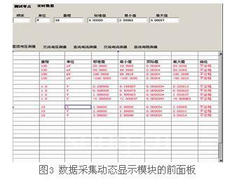 該模塊的主要功能包括:初始化儀器、設(shè)置儀器的狀態(tài)、測(cè)量數(shù)值、數(shù)據(jù)位數(shù)控制、動(dòng)態(tài)顯示數(shù)據(jù)、數(shù)據(jù)結(jié)果判定、數(shù)據(jù)保存等。自動(dòng)化數(shù)據(jù)采集過(guò)程是完全模擬人工測(cè)量過(guò)程進(jìn)行測(cè)量的。儀器的初始化配置以及量程、顯示位數(shù)、精度、采樣數(shù)率、采樣時(shí)間、測(cè)量值、功能選擇等模塊從NI網(wǎng)站上下載,程序員也可以根據(jù)儀器編程說(shuō)明書提供的SCPI語(yǔ)言命令編寫相應(yīng)的模塊。本模塊中的數(shù)據(jù)顯示位數(shù)、數(shù)據(jù)量程、上下限等都是根據(jù)測(cè)試計(jì)量對(duì)儀器的要求而自動(dòng)生成的,數(shù)據(jù)結(jié)果判定也是自動(dòng)完成的。程序把那些不合格的數(shù)據(jù)用紅色的字體顯示,使計(jì)量員在測(cè)量結(jié)束后容易發(fā)現(xiàn)這些數(shù)據(jù)不合格。數(shù)據(jù)采集動(dòng)態(tài)顯示模塊的前面板如圖3所示。