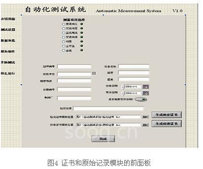 自動(dòng)生成證書和原始記錄,給計(jì)量員的工作帶來(lái)極大的便利,而且消除了人為操作易產(chǎn)生的出錯(cuò),解放了勞動(dòng)力。計(jì)量員只需在證書生成模塊的前面板輸入相關(guān)的儀器信息和校準(zhǔn)信息,校準(zhǔn)項(xiàng)目,選擇相應(yīng)的證書摸板,程序即可自動(dòng)生成相應(yīng)的校準(zhǔn)證書和原始記錄。證書模塊的前面板如圖4所示。
