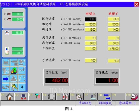 3、首次引用了B&R軟件液壓庫(kù)。塑機(jī)的很多控制部件都是液壓驅(qū)動(dòng)的,動(dòng)作慢、動(dòng)作精度低且運(yùn)動(dòng)軌跡不平滑,運(yùn)用該庫(kù)函數(shù)后,移模動(dòng)作快而穩(wěn),機(jī)器的震動(dòng)大大降低。設(shè)置參數(shù)如圖4所示:
