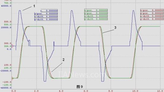 通過修改以上參數(shù)可以得到模架運(yùn)動(dòng)的profile曲線,見圖9的曲線2,依據(jù)速度(V)推算比例閥的流量(Q),再由流量依據(jù)比例閥的流量曲線可以獲得控制電壓的值(U)。實(shí)際獲得的運(yùn)動(dòng)軌跡見圖9的曲線3。圖9的曲線1是比例閥上的控制電壓,從圖中可以看出,實(shí)際的誤差是非常小,曲線的軌跡也非常平滑。