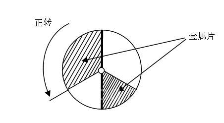葉片采用寬度不一的兩片金屬片相繼通過LC9723探頭,從而產(chǎn)生的脈沖信號的占空比不一來區(qū)別正反轉(zhuǎn)的。原理如下