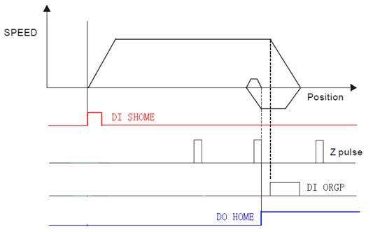 ?。?)定位于Z向脈沖后,驅(qū)動器會輸出DO信號HOME回原點完成信號給PLC輸入點,用來控制其他電氣動作。