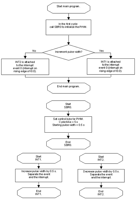 ----下面這個例子說明了脈寬調(diào)制(PWM)是如何工作的。輸出端Q0.0輸出方波信號,其脈寬每周期遞增0.5秒,周期固定為5秒,并且脈寬的初始值為0.5秒,當(dāng)脈寬達(dá)到設(shè)定的最大值4.5秒時,脈寬改為每周期遞減0.5秒,直到脈寬為0為止,以上過程周而復(fù)始