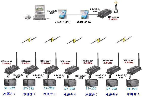本系統(tǒng)中,主站使用2.4ghz高增益全向天線(12dbi),各從站使用2.4ghz高增益定向天線(24dbi)。并要保證主站天線的位置高于周圍各建筑物。為確保無線通信正常,在項(xiàng)目實(shí)施前,對(duì)周圍幾個(gè)井口位置進(jìn)行實(shí)地電測(cè)是十分必要的。電測(cè)使用X24stream電臺(tái)專用測(cè)試軟件,以檢測(cè)各水源井場(chǎng)強(qiáng)信號(hào)強(qiáng)弱,確定天線安裝位置及天線高度,經(jīng)實(shí)際電測(cè),周圍環(huán)境滿足無線通信要求。在安裝調(diào)試過程中,因天線位置離中控室較遠(yuǎn),為減小信號(hào)損耗,主站電臺(tái)到中控室之間的數(shù)據(jù)連接采用有線方式,利用另一公司某款產(chǎn)品解決RS232到RS485之間的協(xié)議轉(zhuǎn)換問題。從站各PLC采用是RS485通信方式,其和電臺(tái)之間的通信采用西門子S7-200專用PPI電纜解決電臺(tái)和PLC之間的協(xié)議轉(zhuǎn)換問題。數(shù)傳電臺(tái)參數(shù)可用電臺(tái)設(shè)置軟件進(jìn)行設(shè)置和修改。經(jīng)過軟件及設(shè)備調(diào)試,無線通信正常,整個(gè)系統(tǒng)運(yùn)行正常。