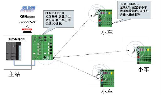 主控單元由PLC控制器和無線基站FLM BT BS 3組成。無線基站作為I/O和PLC控制器的接口設備??赏ㄟ^DEVICENET現場總線方式與歐姆龍PLC CJ1連接。