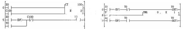 圖5 采用計(jì)數(shù)器指令編程的梯形圖程序 圖6 采用定時(shí)器指令編程的梯形圖