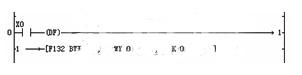 PLC的指令系統(tǒng)中除了基本的邏輯控制指令外,還有豐富的高級(jí)指令,可以方便的實(shí)現(xiàn)數(shù)據(jù)傳輸、算術(shù)運(yùn)算、比較、變換、移位、位控制等各種功能。熟悉并在實(shí)際中合理的應(yīng)用合適的高級(jí)指令,可以大大簡化程序,這一點(diǎn)是傳統(tǒng)的繼電器控制系統(tǒng)無法比擬的。如圖11所示的一行指令,采用高級(jí)指令F132 (BTI)使WY0的0位即Y0在X0的每次上升沿變反,即可實(shí)現(xiàn)控制要求。
