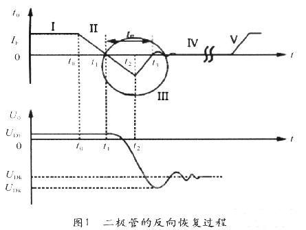 實(shí)際上已導(dǎo)通的二極管在突然加上反向電壓的一段時(shí)間內(nèi),電流下降到零以后,它并不立刻停止導(dǎo)通,還處于反向低阻狀態(tài)。此時(shí)在反向電壓作用下,載流子進(jìn)入復(fù)合過(guò)程,于是在反方向繼續(xù)流過(guò)電流;當(dāng)載流子復(fù)合完畢,反向電流才迅速衰減到零。這個(gè)階段就是二極管的反向恢復(fù)過(guò)程,如圖1所示?! ?
