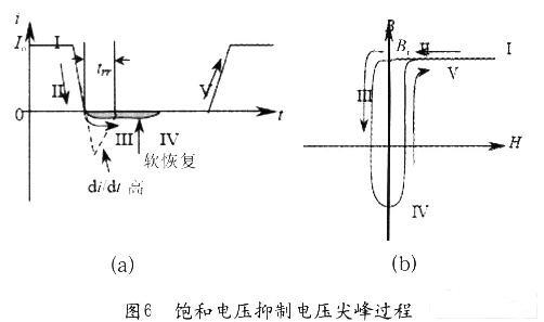 如果在二極管反向恢復(fù)時(shí)間內(nèi),磁芯的伏秒足夠大,即二極管反向阻斷(圖(a)中“IV”)前沒(méi)有反向飽和(圖(b)中“IV”點(diǎn)),二極管完全恢復(fù),則噪聲基本上可以消除。