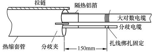 12.分歧電纜一端,距熱縮套管150毫米處應(yīng)用扎線永久綁扎固定后,方可 進(jìn)行加溫烘烤熱縮套管
