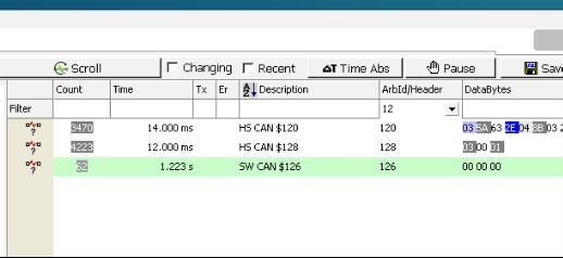 可以在圖中箭頭所指處過濾通信報文,比如說只想觀察ID中有“1、2”的報文,只需要在ID欄鍵入“12”即可,如下圖所示。VSPY的過濾方法和除了上述以外還有很多,用戶還可以根據自己的想法任意采集和保存需要的數據,因本文主要講解數據解碼,故在此不作鏊述。