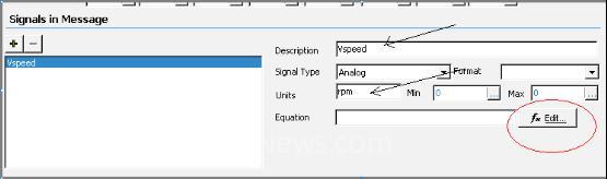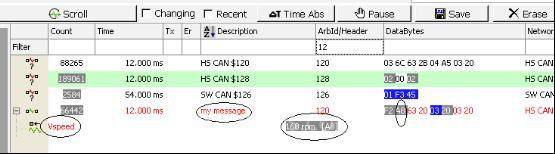 自定義解碼:如我們將ID為120的報文的第二個字節(jié)解碼為車速信號,信號名為Vspeed,單位為rpm