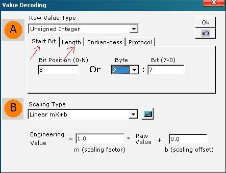 步驟3:解析信號:點擊上圖紅圈處按鈕,調出解析面板提取報文中信號字節(jié)(箭頭所示意,選擇起始位和所占字節(jié)長度,B處還可以對該信號做線性變換),解析過程完成。