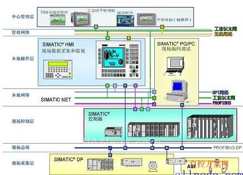 本地操作層:現(xiàn)場監(jiān)視的工業(yè)計(jì)算機(jī),通過各種組態(tài)軟件進(jìn)行各種數(shù)據(jù)采集、顯示、存儲,也可以對下面的控制器進(jìn)行控制和設(shè)置。由于現(xiàn)在的控制器支持多種通訊方式,所以,本層可以大量使用運(yùn)行組態(tài)工程的人機(jī)界面產(chǎn)品,監(jiān)視運(yùn)行、控制、數(shù)據(jù)上傳等。同時(shí),可以使用便攜式調(diào)試設(shè)備進(jìn)行控制器和人機(jī)界面產(chǎn)品的實(shí)時(shí)維護(hù)。比如,使用西門子的TP270HMI產(chǎn)品進(jìn)行系統(tǒng)監(jiān)視、控制,使用西門子便攜式編碼器PG產(chǎn)品或者裝有西門子HMI軟件和STEP7系列控制器PLC編程軟件的筆記本(帶串行口和以太網(wǎng)等網(wǎng)絡(luò)通訊口),進(jìn)行TP270HMI組態(tài)工程的維護(hù)和修改,同時(shí),可以修改PLC控制器的邏輯命令,監(jiān)視控制器的運(yùn)行狀況。