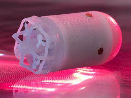 后面小螺旋槳作為驅(qū)使力,這臺相機膠囊機器人可以用來探索人體的消化系統(tǒng)。病人把它“吃”下去以后,它將在人體內(nèi)“游”視需探索的領(lǐng)域。(圖:皇家外科學院/意大利比薩圣安娜)