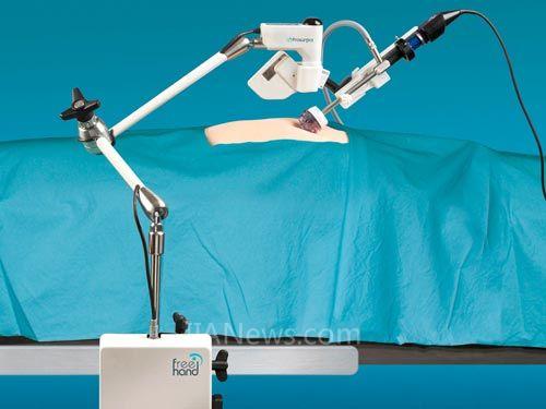 外科醫(yī)生可以用腳來操作“FreeHand”儀器,這種腹腔鏡攝像機通常在進行微創(chuàng)手術(shù)時使用(亦稱“鎖孔手術(shù)”)。這意味著醫(yī)生在手術(shù)中可以空出手來。(圖:Prosurgics有限公司)