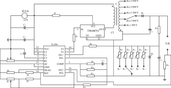 圖1所示為數(shù)字絕緣電阻測試儀用高壓直流電源的電路原理。電源為12V蓄電池,要求在10V以上時仍能保證系統(tǒng)正常工作,開關(guān)器件選用了TWH8751型開關(guān)集成電路。針對電路輸出功率小,輸出電壓高,體積小等特點(diǎn),采用了單端反激式的變換器拓?fù)?,高頻開關(guān)變壓器的次級繞組有對應(yīng)直流500V,1000V,1500V,2000V和2500V的5組抽頭,可由用戶根據(jù)需要選擇聯(lián)動多投旋鈕開關(guān)的檔位,以對次級繞組抽頭和相對應(yīng)的輸出電壓采樣電阻進(jìn)行同時切換。根據(jù)對輸出電壓和電流的采樣,控制電路將及時改變開關(guān)器件的導(dǎo)通寬度,從而穩(wěn)定地輸出期望電壓,并提供了過壓過流保護(hù)。