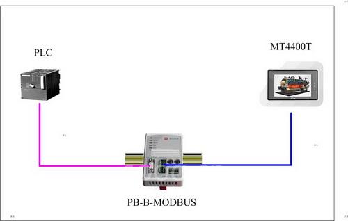 在Profibus-DP網(wǎng)絡(luò)中,西門子PLC(帶有DP通訊功能)作DP主站,PB-B-MODBUS作DP從站; 另外,在Modbus 網(wǎng)絡(luò)端,eView(為MT4400T為例)觸摸屏作Modbus Master,PB-B-MODBUS作Modbus Slave。(如圖1-1所示)
