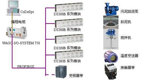 圖1 是整個(gè)系統(tǒng)的結(jié)構(gòu)圖,主站用的是萬(wàn)可的PLC,具體型號(hào)為WAGO-I/O-SYSTEM 758,配置軟件用的是CoDeSys。從站設(shè)備用到的有通訊適配器CC-PB-1.0 4塊,16點(diǎn)的數(shù)字量輸入IO-DI16DC24 4塊,16點(diǎn)的數(shù)字量輸出IO-DO16DC24 5 塊,8點(diǎn)輸入和8點(diǎn)輸出的數(shù)字量模塊 IO-DI8DO8DT05 2塊,8路模擬量輸入模塊IO-AI8OP16 6塊,6路熱電阻輸入模塊IO- RTD6OP16 10塊,以及一些變頻器和軟啟動(dòng)器等來(lái)控制一些電磁閥、比例閥、接觸器、溫度變送器、PH值變送器等,執(zhí)行機(jī)構(gòu)為污泥回流泵、刮泥機(jī)、攪拌機(jī)等。