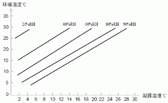 圖1 凝露傳感器與線性濕度傳感器特性曲線 a) 在相對(duì)濕度不高時(shí)凝露傳感器有一個(gè)離散區(qū),在這區(qū)間對(duì)相對(duì)濕度變化不敏感而且變化的阻值也不精確,其輸出特性不但和相對(duì)濕度的大小有關(guān),和露點(diǎn)溫度也有直接關(guān)系。例如:有時(shí)我們感覺(jué)到空氣中濕度很大,但加熱器并沒(méi)有啟動(dòng),這是由于傳感器表面沒(méi)有達(dá)到露點(diǎn)溫度(也就是在傳感器表面沒(méi)有結(jié)成水珠)的緣故。 b) 由于凝露傳感器必須不斷地吸入或釋放水分子,傳感器受空氣中灰塵或水份中的化學(xué)物質(zhì)侵蝕后會(huì)改變靈敏度,導(dǎo)致防凝露的控制點(diǎn)出現(xiàn)偏差,這時(shí)會(huì)出現(xiàn)在濕度已是很高,凝露極易發(fā)生的情況下還沒(méi)有啟動(dòng)加熱器,或者加熱啟動(dòng)后長(zhǎng)期不會(huì)自動(dòng)退出的現(xiàn)象,這就降低了防凝露靈敏度和可靠性。 2.2 常用的二種防凝露方法 方式1:在開(kāi)關(guān)柜電纜室、斷路器室各安裝一個(gè)鋁合金加熱器(一般為150W),鋁合金加熱器工作時(shí),其表面溫度為120℃ ~ 130℃。通過(guò)空氣散熱除濕,由用戶根據(jù)工作環(huán)境狀態(tài)人工控制加熱器的投入、切除; 方式2:防凝露自動(dòng)除濕控制器安裝在開(kāi)關(guān)柜儀表室,凝露傳感器安裝在開(kāi)關(guān)柜柜內(nèi),鋁合金加熱器分別安裝在開(kāi)關(guān)柜電纜室、斷路器室,利用凝露傳感器的動(dòng)作特性來(lái)自動(dòng)啟動(dòng)加熱器投入、切除。 2.3 存在問(wèn)題 方式1是靠人力完成加熱器的投入和切除,因此使用的可操作性很差,往往會(huì)出現(xiàn)兩個(gè)極端情況。其一是加熱投入后不關(guān),會(huì)造成不必要耗電浪費(fèi)。其二是沒(méi)有隨氣候變化及時(shí)啟動(dòng)加熱器,柜內(nèi)很潮濕時(shí)得不到加熱除濕,一旦發(fā)生爬電、閃絡(luò)會(huì)造成巨大損失。 方式2是利用凝露傳感器自動(dòng)啟動(dòng)加熱器的,也存在兩個(gè)缺陷。其一;這種凝露傳感器是被動(dòng)型動(dòng)作器件,即一定要在空氣中的水汽壓力飽和時(shí),也就是在物體表面到達(dá)露點(diǎn)溫度,凝露發(fā)生時(shí)才會(huì)驅(qū)動(dòng)加熱工作。從檢測(cè)凝露到消除凝露這一過(guò)程可以看出:首先要用凝露傳 感器來(lái)檢測(cè)到凝露(那就一定是在凝露發(fā)生時(shí))才能啟動(dòng)加熱器。而防凝露作為一個(gè)電柜反事故重要措施來(lái)說(shuō),接近凝露的邊緣再啟動(dòng)加熱來(lái)消除凝露,就缺少一個(gè)預(yù)防過(guò)程。從安全、可靠的角度來(lái)看,作為一個(gè)反事故措施在可靠性上還是遠(yuǎn)遠(yuǎn)不夠的。其二,如果凝露傳感器安裝位置不當(dāng),或者凝露傳感器的表面受到灰塵或氣體的侵蝕后特性已改變,雖然柜壁已有結(jié)露現(xiàn)象,但凝露控制器仍不能及時(shí)啟動(dòng)加熱器投入,也會(huì)帶來(lái)嚴(yán)重后果。 因此,為了提高可靠性,電力運(yùn)行單位往往會(huì)采用一些輔助手段來(lái)保障電柜的安全渡汛,如上海電力公司采用了進(jìn)入霉雨季節(jié)就強(qiáng)制長(zhǎng)通電加熱的辦法。這種方法,雖然加強(qiáng)了防凝露的措施,但也帶來(lái)了電力損耗和浪費(fèi)。 三、開(kāi)關(guān)柜防凝露新方案及優(yōu)越性 針對(duì)開(kāi)關(guān)柜常用防凝露方法存在問(wèn)題,為提高開(kāi)關(guān)柜防凝露可靠性及減少電力消耗,提出了一種開(kāi)關(guān)柜新穎防凝露控制方案。 3.1 “凝露”的基本概念及新方案依據(jù) 什么是凝露? 所謂結(jié)露現(xiàn)象是指柜體內(nèi)壁表面溫度下降到露點(diǎn)溫度以下時(shí),內(nèi)壁表面會(huì)發(fā)生水珠凝結(jié)現(xiàn)象。這個(gè)現(xiàn)象稱之為結(jié)露。結(jié)露是否發(fā)生取決于室內(nèi)溫度、柜內(nèi)溫度、相對(duì)濕度以及露點(diǎn)溫度。 什么是露點(diǎn)溫度? 露點(diǎn)溫度是指在一定溫度的空氣中,水蒸汽的最大含量稱為[飽和水蒸汽量],此時(shí)的空氣成為[飽和空氣],飽和空氣溫度下降時(shí),空氣中的水蒸氣將凝結(jié)成水珠。含有水蒸氣的空氣的飽和溫度,稱為露點(diǎn)溫度。請(qǐng)參考溫度、濕度、和露點(diǎn)的相關(guān)數(shù)據(jù)表(表1)。 表1 溫度、濕度和露點(diǎn)的相關(guān)數(shù)據(jù)表格