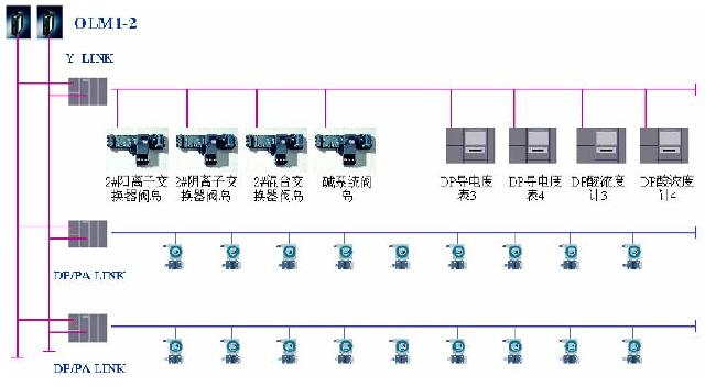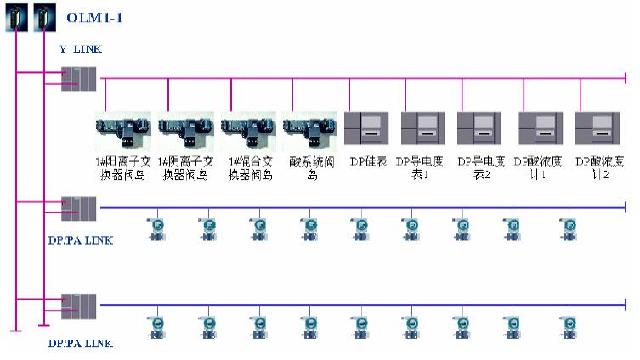 我們知道補給水系統(tǒng)由預(yù)處理系統(tǒng)、化學(xué)除鹽系統(tǒng)和酸堿系統(tǒng)構(gòu)成,主要工藝設(shè)備包括陰床、陽床、混床、酸堿箱、風(fēng)機、水泵等,主要測量儀表包括壓力變送器、差壓變送器、液位計、流量計、溫度、酸度計、堿度計、硅表、鈉表、濁度計等;另外還有大量的氣動隔膜閥、電機等。對于這樣的系統(tǒng),我們可以采用PROFIBUS 總線來完成監(jiān)控任務(wù)。