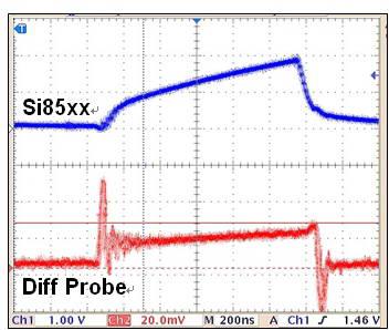 這種令人迷惑的簡(jiǎn)單架構(gòu)卻能提供許多傳統(tǒng)電流檢測(cè)技術(shù)無(wú)法提供的優(yōu)點(diǎn)。例如,通過(guò)使用標(biāo)準(zhǔn)CMOS處理技術(shù)和半導(dǎo)體封裝實(shí)現(xiàn)了極低的成本,這兩種技術(shù)使得該架構(gòu)的成本可能比CT的安裝成本還有競(jìng)爭(zhēng)力,而且還有更高可靠性和更小體積等附加優(yōu)點(diǎn)。同時(shí)還實(shí)現(xiàn)了較低的損耗,這是因?yàn)榍镀陔娏鳈z測(cè)通道中僅僅增加了1.3mΩ的串聯(lián)電阻和2nH的串聯(lián)電感。還有一個(gè)附加的優(yōu)點(diǎn),就是通過(guò)對(duì)積分操作進(jìn)行平均,將輸出噪聲減到了最小,從而節(jié)省了外部RC濾波器的成本和空間。它甚至還能抑制變壓器耦合設(shè)計(jì)中的邊沿噪聲,從而無(wú)需邊沿消隱。圖2和圖3分別通過(guò)將未濾波的輸出比作(在低值傳感電阻上使用差分探頭)測(cè)得的電流和CT電路(CT、二極管和RC濾波器)來(lái)展示了低噪聲原理。在兩種情況下,交流電流傳感器都幾乎沒(méi)有噪聲。