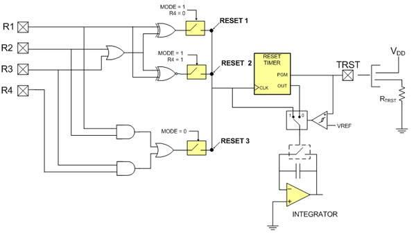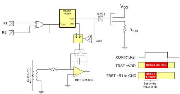 如圖4所示,當(dāng)TRST輸入被連接到VDD時(shí),積分器復(fù)位可以受R1和R2上的信號(hào)的實(shí)時(shí)控制。為了滿足高頻或/和高占空比應(yīng)用,可以將TRST通過(guò)定時(shí)電阻RTRST連接到地來(lái)縮短復(fù)位時(shí)間。在這種情況下,復(fù)位的啟動(dòng)由R1和R2觸發(fā),持續(xù)時(shí)間則由RTRST決定。在較高速度的操作時(shí),允許用戶對(duì)傳感器精度進(jìn)行調(diào)整。