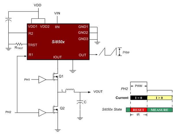 片上積分器復(fù)位邏輯具有足夠的靈活度,允許這種電流傳感器能夠與任意的電源系統(tǒng)拓?fù)湟黄鹗褂谩D4所示的是用于單輸出Si850x的復(fù)位電路。這些器件通??梢杂糜诓淮嬖谧儔浩鞔磐ㄆ胶饪刂茊?wèn)題的相對(duì)簡(jiǎn)單一些的應(yīng)用(如降壓和升壓電路)中。