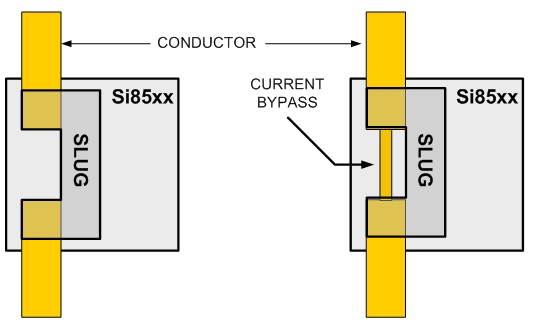 左圖為安裝在電路板上的電流傳感器的“x射線圖”。這是一種標(biāo)準(zhǔn)的安裝方法,在載流導(dǎo)體中有一間隙,該間隙通過(guò)電流傳感器中的金屬嵌片橋接起來(lái),從而允許全部被測(cè)電流流過(guò)嵌片。右圖中增加了一個(gè)與嵌片平行的小電流旁路線,它們構(gòu)成一個(gè)分流器,旁路線的寬度和厚度則決定了分流比。例如,一個(gè)1mm寬的旁路線能將從嵌片上分流足夠的電流,使Si85xx的滿刻度增加1.8倍,達(dá)到36A。