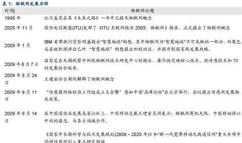 實(shí)際上,物聯(lián)網(wǎng)概念起源于比爾蓋茨1995年《未來之路》一書,在《未來之路》中,比爾蓋茨已經(jīng)提及物聯(lián)網(wǎng)概念,只是當(dāng)時受限于無線網(wǎng)絡(luò)、硬件及傳感設(shè)備的發(fā)展,并未引起重視。隨著技術(shù)不斷進(jìn)步,國際電信聯(lián)盟于2005年正式提出物聯(lián)網(wǎng)概念,而今年奧巴馬就職演講后對IBM提出的"智慧地球"積極響應(yīng)后,物聯(lián)網(wǎng)再次引起廣泛關(guān)注。而我國官方近期對傳感網(wǎng)(物聯(lián)網(wǎng)的另一稱謂)的多次提議表示我國物聯(lián)網(wǎng)的發(fā)展也正是提上議事日程,同時也表明我國物聯(lián)網(wǎng)的發(fā)展將加快。目前,我國傳感網(wǎng)標(biāo)準(zhǔn)體系已形成初步框架,向國際標(biāo)準(zhǔn)化組織提交的多項(xiàng)標(biāo)準(zhǔn)提案被采納。