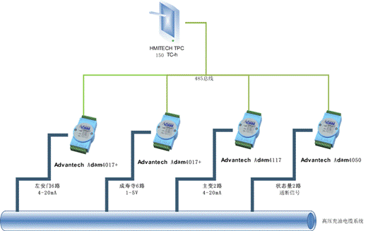 用模擬量采集模塊ADAM4017+采集14路高壓充油電纜的油壓,由ADAM4050采集2路開(kāi)關(guān)量信號(hào),通過(guò)RS485和TPC150TC-h連接,把采集的模擬量和數(shù)字量顯示到TPC中,由上位機(jī)的組態(tài)軟件HMIBuilder處理之后將信息通過(guò)局域網(wǎng)發(fā)給中心主檢測(cè)計(jì)算機(jī)。數(shù)據(jù)上傳是采用modbusTCP轉(zhuǎn)發(fā),在中心主計(jì)算機(jī)上可以實(shí)現(xiàn)檢測(cè)的功能。