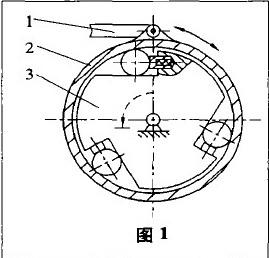 超越離合器通常在自動鍛壓機(jī)上是完成送料動作的主要機(jī)構(gòu),利用它的單向性完成棒形料的進(jìn)給,送料長度精確、可靠。它的工作原理如圖1所示:主動桿1帶著2往復(fù)運(yùn)動時(shí),從動軸3做單向轉(zhuǎn)動。我們利用它的主動軸轉(zhuǎn)一周中180o使從動軸轉(zhuǎn)動、另180o使從動軸停止的特性,來實(shí)現(xiàn)所需的間歇動作。