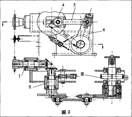 改造后的傳動結(jié)構(gòu)裝配圖如圖2所示。動力由沖床曲軸通過滾子鏈、一對錐齒輪和一套四連桿機(jī)構(gòu)傳過來,滾子鏈由張緊輪張緊,離合器在Ⅲ軸上,同制動輪、制動帶配合實(shí)現(xiàn)Ⅲ軸的間歇運(yùn)動。工件分度的角度調(diào)整范圍由四連桿機(jī)構(gòu)控制,角度變化時(shí)由調(diào)節(jié)四連桿中的4、6桿的長度來實(shí)現(xiàn)。桿4用來粗調(diào),桿6 用來精調(diào),角度變化從刻度盤上可以看到。