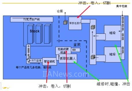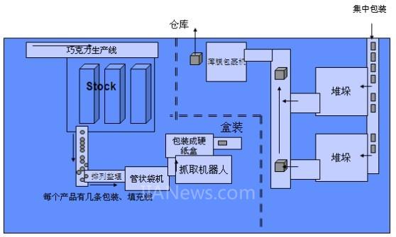 這是一個(gè)巧克力生產(chǎn)包裝線的例子。巧克力從生產(chǎn)線上通過傳輸帶運(yùn)輸?shù)?個(gè)集聚地(Stock)。巧克力經(jīng)過通道進(jìn)行1個(gè)排列整理整齊,例如被排列成4x6的式樣。然后經(jīng)過管狀袋裝機(jī)將每個(gè)巧克力包裝在1個(gè)密封的塑料袋中。接著由1臺抓取機(jī)器人將裝有巧克力的塑料袋抓取到盒式包裝機(jī),由該機(jī)器將含有巧克力的密封塑料袋進(jìn)行20袋一盒的硬紙包裝。然后經(jīng)過一系列的通道將巧克力的盒式硬紙包裝運(yùn)輸?shù)蕉讯鈾C(jī)上,由堆垛機(jī)進(jìn)行裝箱(100盒),接著由薄膜包裹機(jī)對箱子進(jìn)行包裹薄膜用于保護(hù),最后進(jìn)倉庫進(jìn)行存儲。