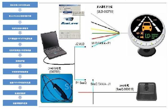 AWS系統(tǒng)的安裝類似安裝倒車?yán)走_(dá),但并不需要破壞原車的任何線路或是部件。首先找到車輛的一些信號(hào)(轉(zhuǎn)向燈信號(hào),剎車信號(hào),車速信號(hào)等),通過(guò)電纜將其接入AWS系統(tǒng)中央控制盒。然后將攝像頭固定在駕駛室內(nèi)前風(fēng)擋玻璃中央,接好攝像頭的電纜線,將視頻信號(hào)接入筆記本,用相應(yīng)軟件進(jìn)行初始設(shè)置。而后在車內(nèi)左右側(cè)分別安裝用于聲音提醒的揚(yáng)聲器,并固定圖像顯示器,接好相關(guān)線束后進(jìn)行最后的路試,檢查AWS各功能是否正常。整個(gè)安裝過(guò)程,基本半天的時(shí)間就能完成,而且如需拆卸,也非常方便。